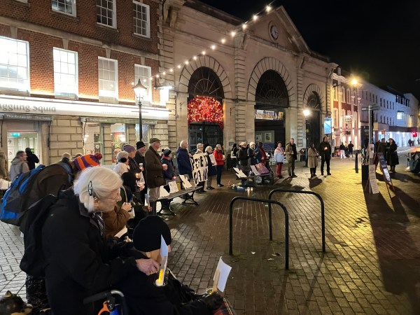 The 52nd Vigil was held today in the Market Square in Salisbury and 30 attended. There was a kind of irony around today’s event as we looked out over the Market Square which was festooned with Christmas lights with the market in full swing. The Vigil is about peace in the region where Christianity began. With an estimated 44,000 dead in Gaza the notion of ‘peace and goodwill to all men’ seemed a long way off. Gaza and Palestine generally (however it is delineated) is precisely the area where Christianity was started yet here we are looking at a raging war and hatred seeming to be the defining spirit.